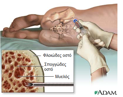 Εξέταση του μυελού των οστών. Η εξέταση αυτή λέγεται μυελόγραμμα και συνίσταται στη λήψη υλικού με ειδικές βελόνες συνήθως από τα οστά της λεκάνης ή του στέρνου. Η εξέταση δεν είναι ανώδυνη και επιβάλλεται τοπική αναισθησία ή βραχεία νάρκωση. Το υλικό το οποίο λαμβάνεται ελέγχεται με ειδικές χρώσεις (επιχρίσματα μυελού) και παράλληλα γίνονται και άλλες εξειδικευμένες εξετάσεις.
